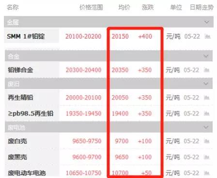 5月22日 周二 鉛價漲400元/噸,均價20150 元/噸