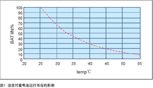 失水的途徑比較多:節(jié)流閥設(shè)計(jì)不合理,頻繁開啟;電源對蓄電池頻繁均充;環(huán)境溫度過高。其中高溫是最主要的因素,高溫會加速蓄電池失水速度,導(dǎo)致蓄電池容量下降。以25℃為基準(zhǔn),當(dāng)蓄電池運(yùn)行環(huán)境上升10℃,壽命減少50%,如圖1所示。