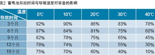 蓄電池在存放過程中存在自放電,如果長時(shí)間得不到補(bǔ)充,就會出現(xiàn)硫酸鹽化現(xiàn)象。這種現(xiàn)象如果沒有得到及時(shí)改善,蓄電池容量會降低甚至損壞不能使用。蓄電池在存貯過程中,環(huán)境溫度對容量影響也非常大,如表2所示。